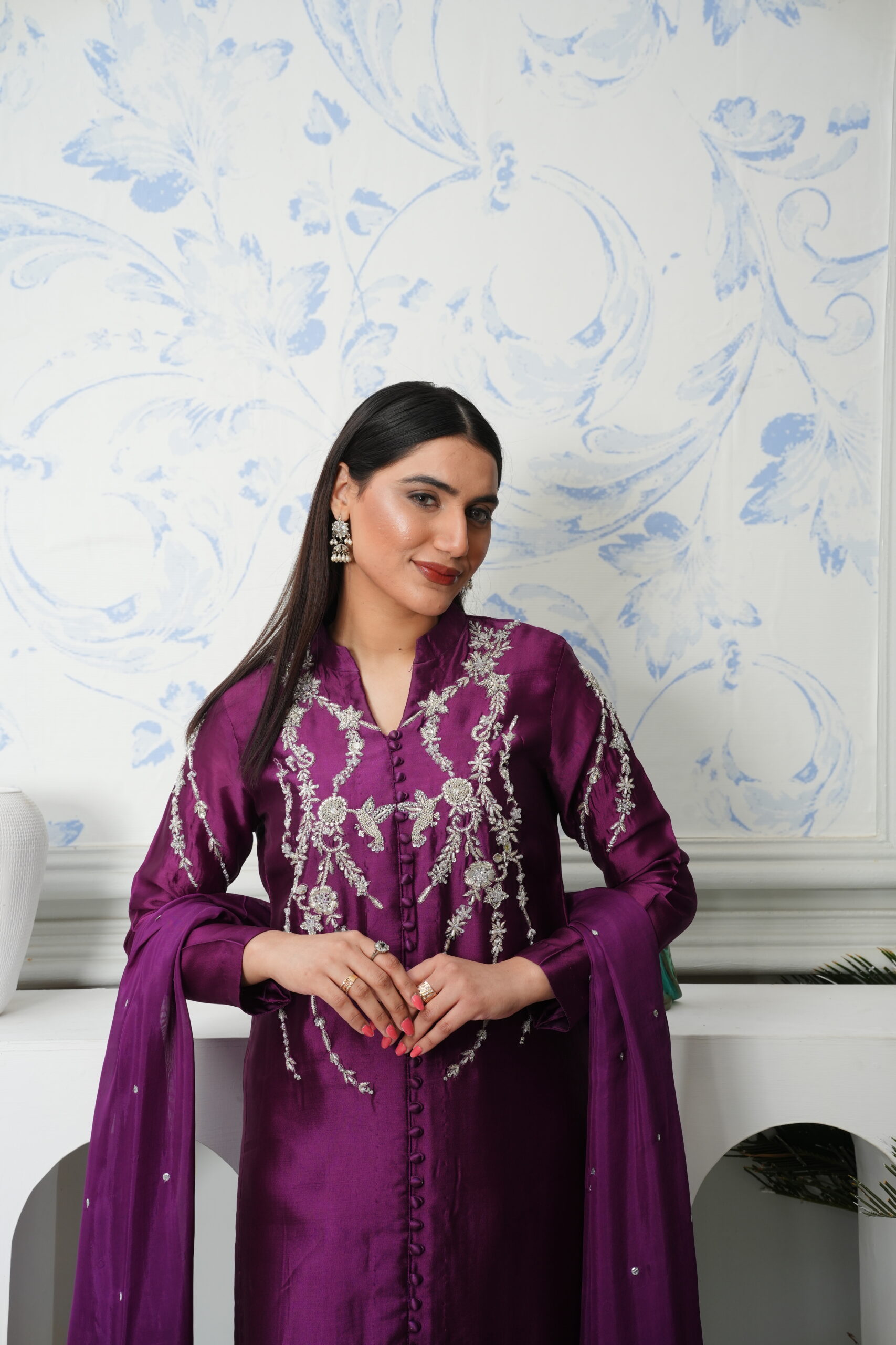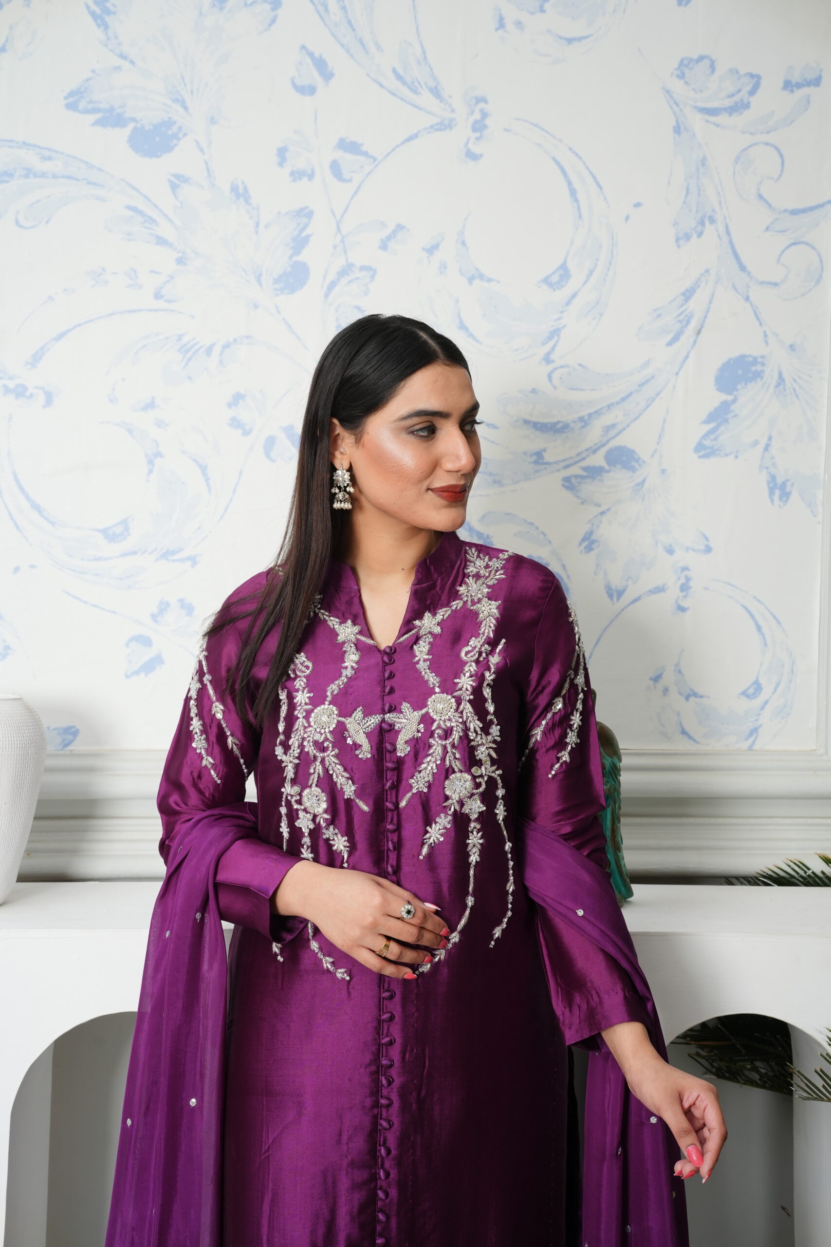 Dry clean only. Handle with care to preserve fabric texture and embellishment. Avoid direct contact with perfume, moisture, or heat. Store in a cool, dry place.